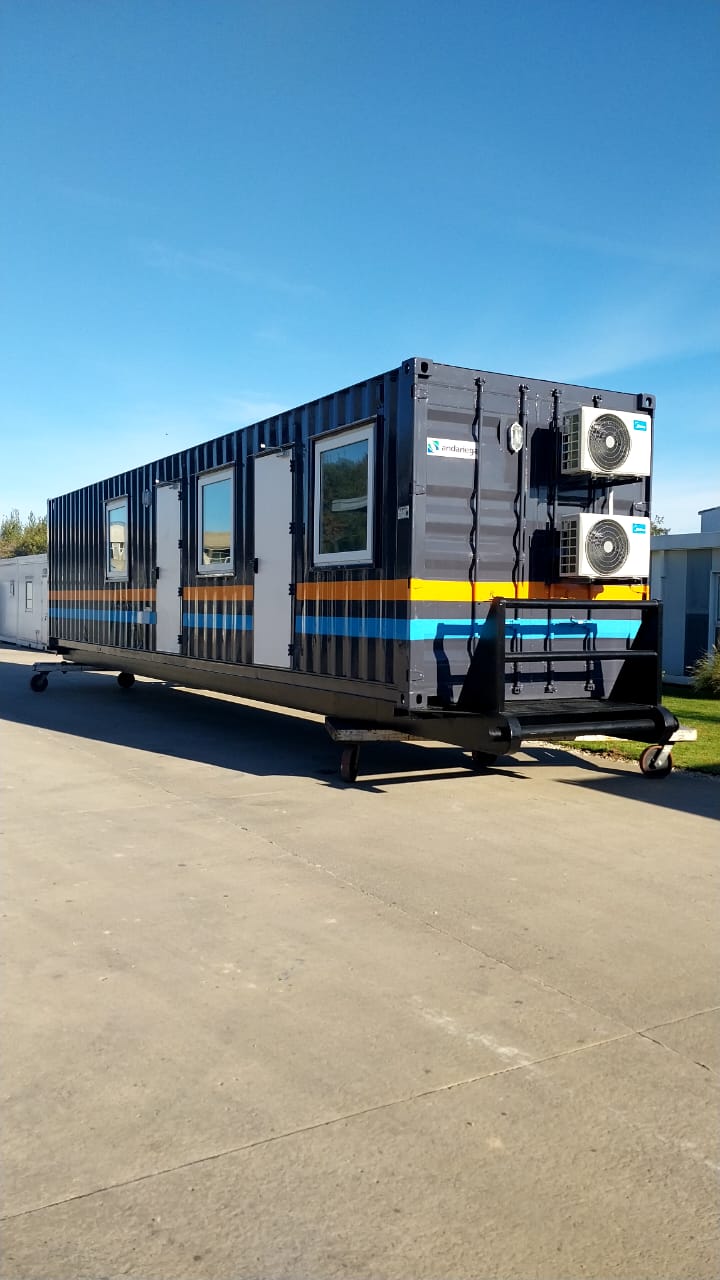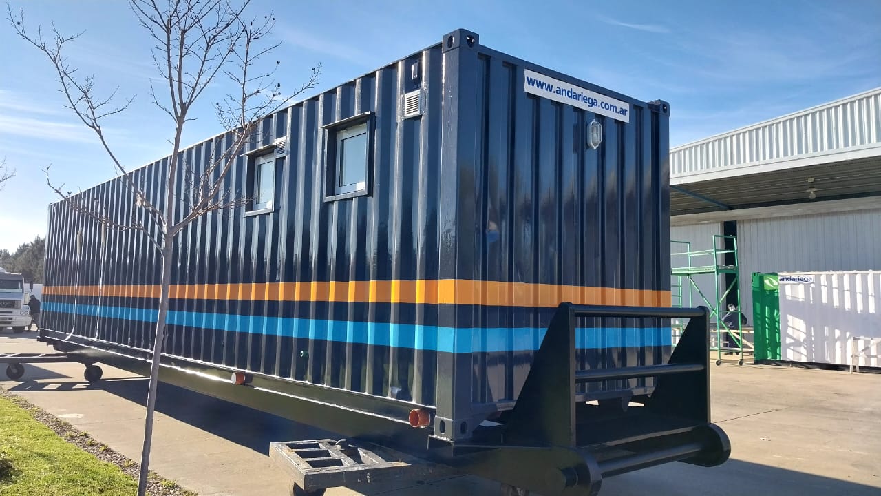 Contenedores nacionales usados reacondicionados, estructura reforzada, aislación con lana de vidrio, paneles interiores de melamina, ventanas DVH con cortinas black-out, instalación eléctrica normalizada, iluminación LED, equipamiento de oficina completo (escritorios, sillas ergonómicas, TV, pizarras), cocina y baño equipados, y extractor para depósito.